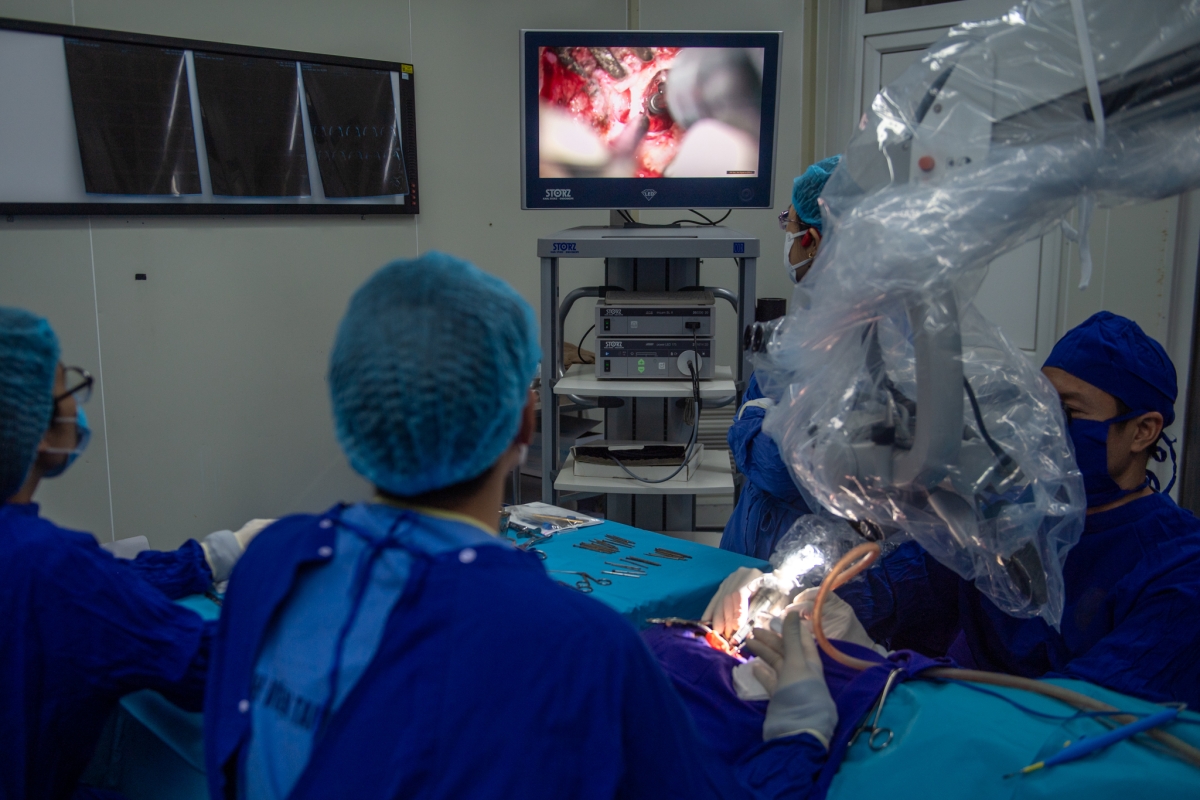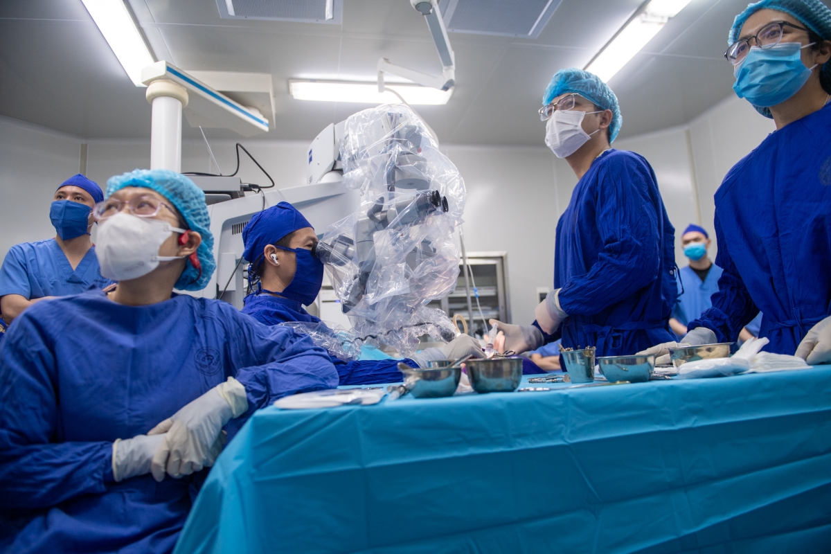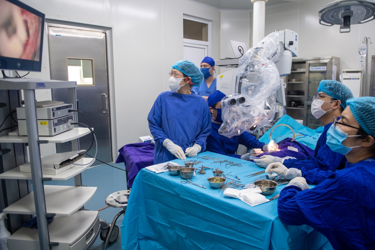 “Khó nhất là tiếp cận qua ngách mặt để vào tai giữa. Phải khoan rất lâu, trong khi luôn phải tránh tổn thương dây thần kinh mặt”, TS Huy vừa thao tác vừa giải thích cho các bác sĩ trẻ trong phòng mổ.