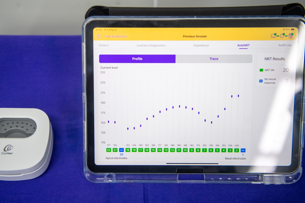 Sau khi đặt xong, ê kíp tiến hành đo trở kháng và đo đáp ứng thần kinh. Khi ghi nhận được tín hiệu truyền lên hệ thần kinh thính giác, cả ê kíp thở phào.