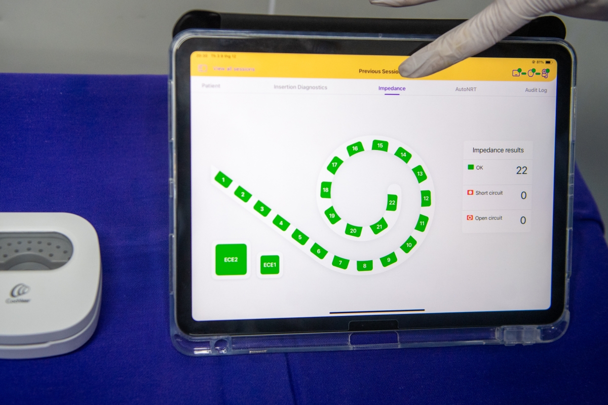 “Với ốc tai dị dạng, nếu chỉ dựa vào cảm giác tay sẽ rất rủi ro. Dữ liệu theo thời gian thực giúp chúng tôi biết điện cực đang đi đến đâu, có bị lệch hay gập đầu hay không để chỉnh ngay”, TS Huy phân tích.