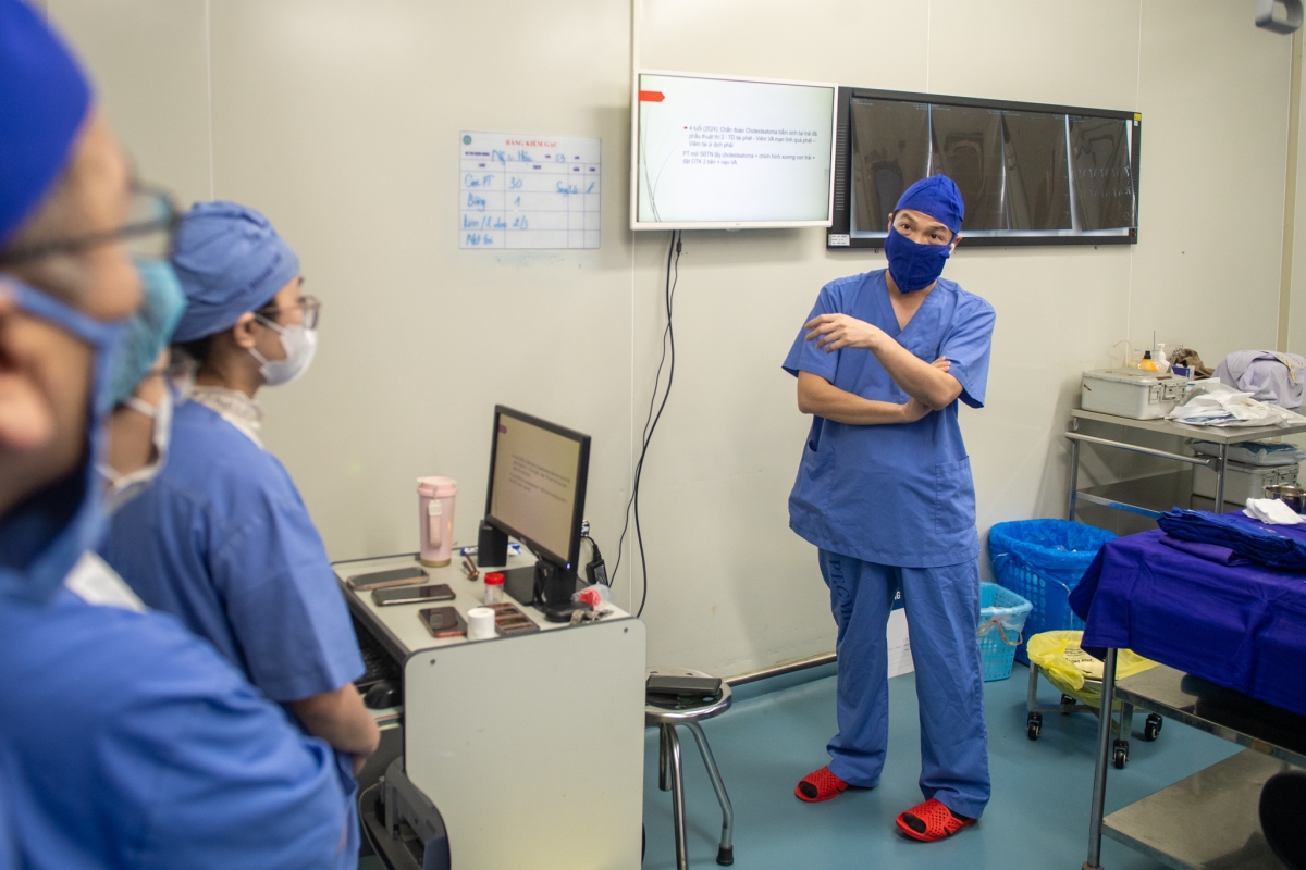 Ngay trước giờ G, TS.BS Nguyễn Hoàng Huy, Trưởng khoa Tai cùng ê-kíp mổ phân tích rõ mức độ phức tạp của trường hợp này.