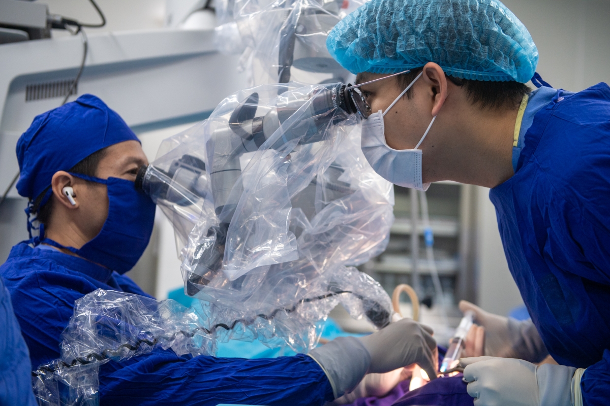 Dưới ánh đèn phẫu thuật, TS.BS Nguyễn Hoàng Huy tập trung cao độ khi bắt đầu bước quan trọng nhất của ca mổ: luồn điện cực vào ốc tai.