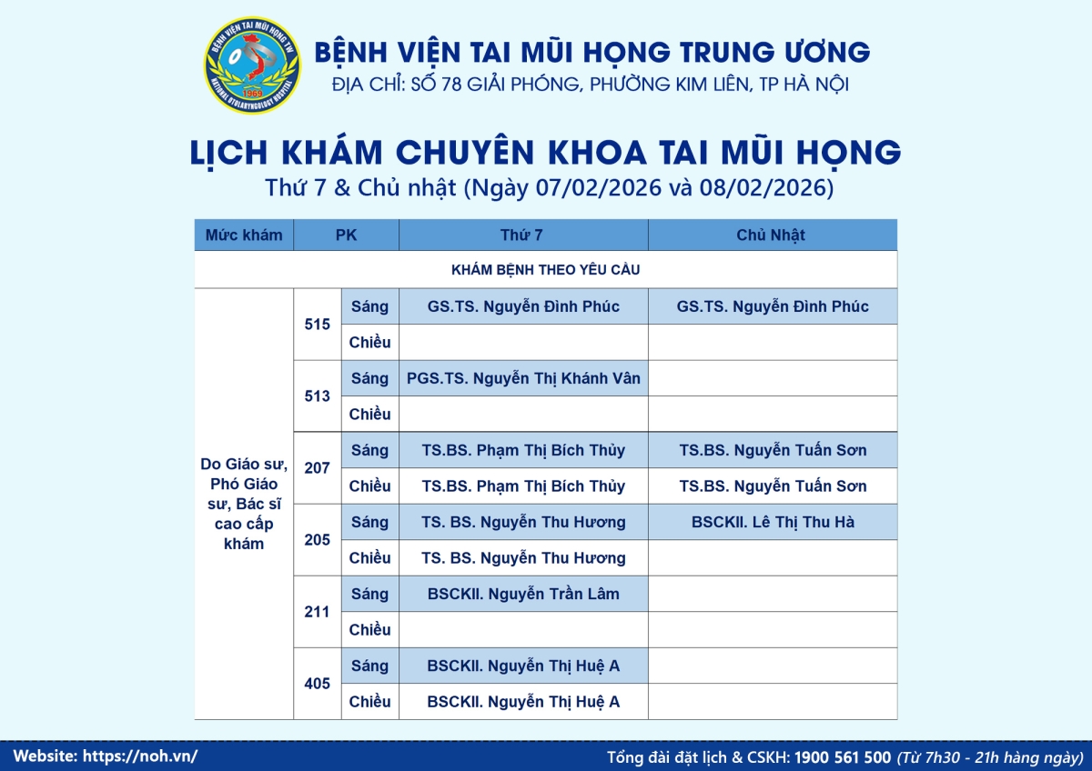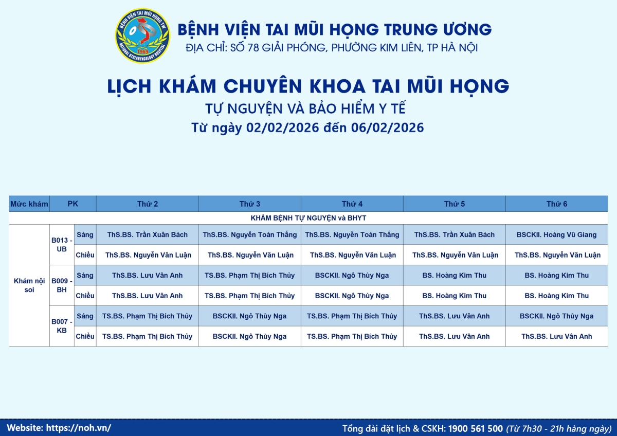 Lịch khám chuyên khoa Tai Mũi Họng (Từ 02/02/2026 - 08/02/2026)