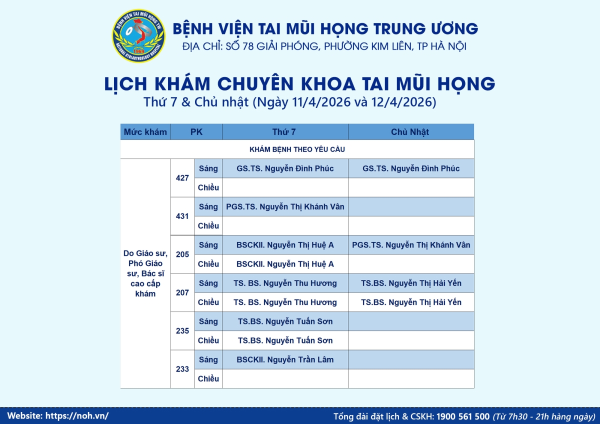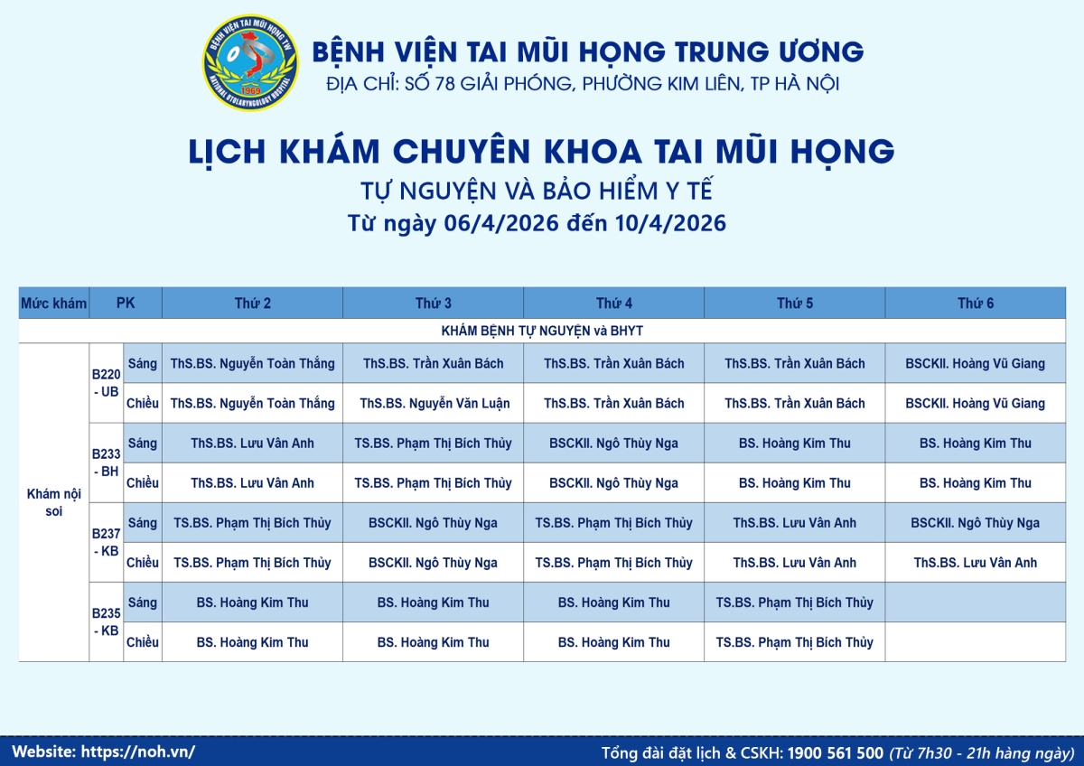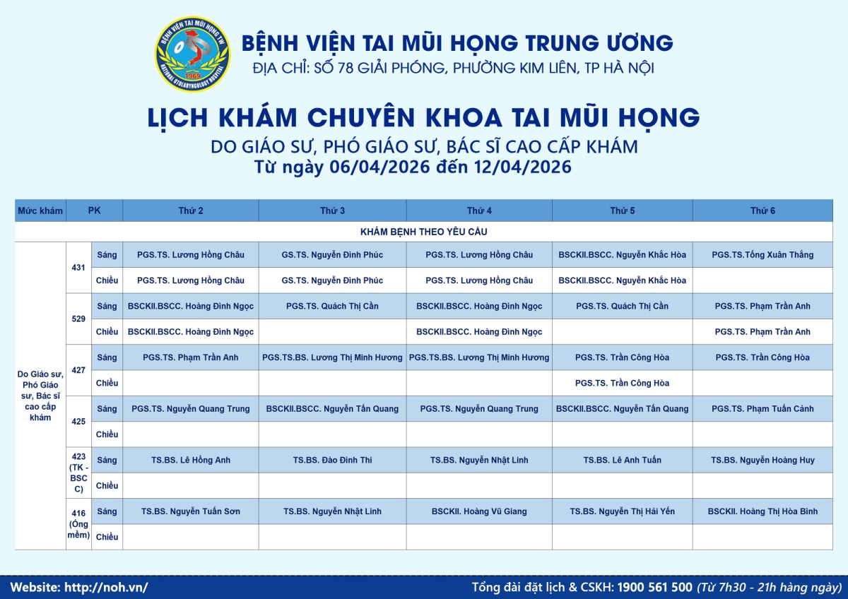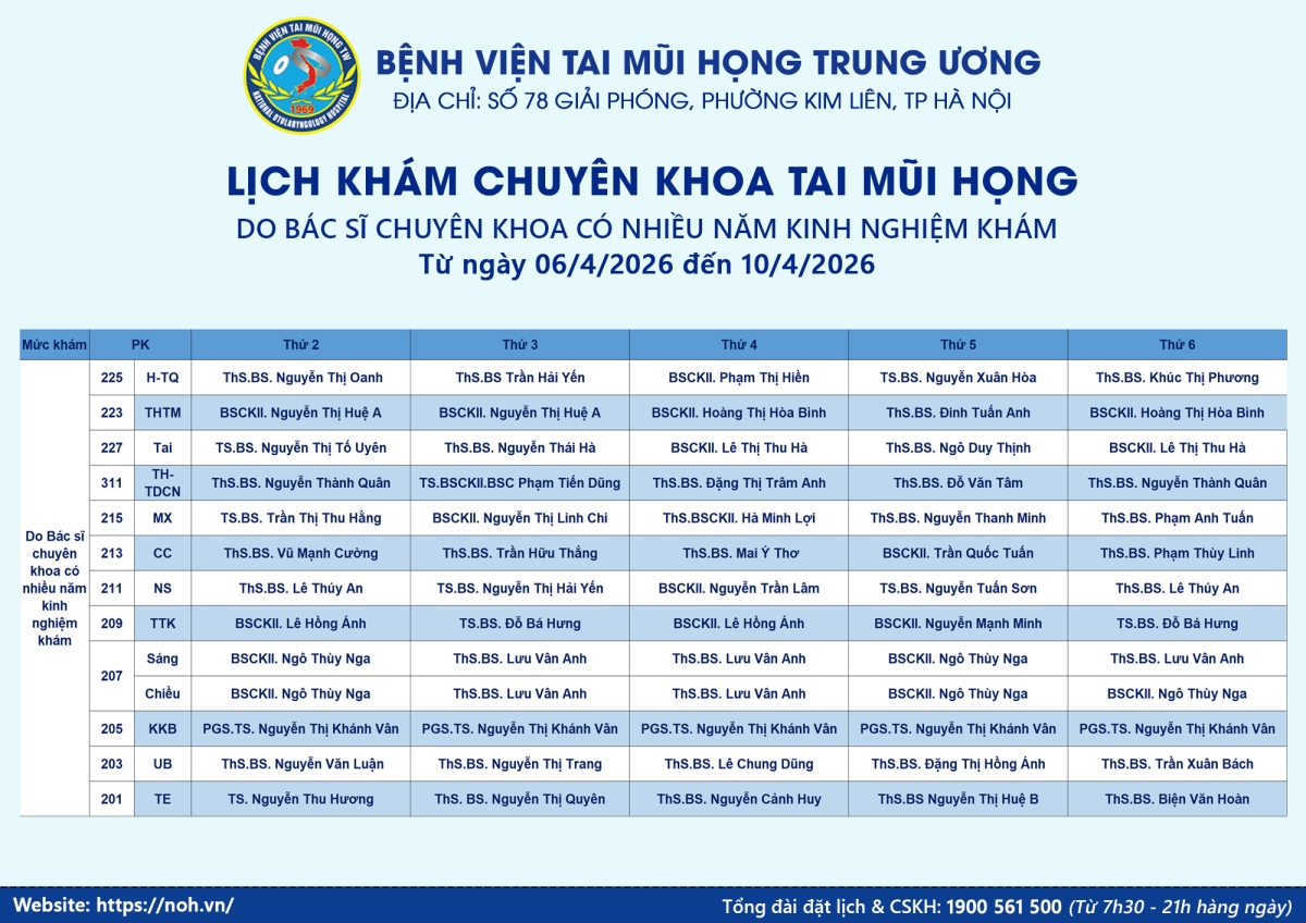 Lịch khám chuyên khoa Tai Mũi Họng (Từ 06/04/2026 - 12/04/2026)