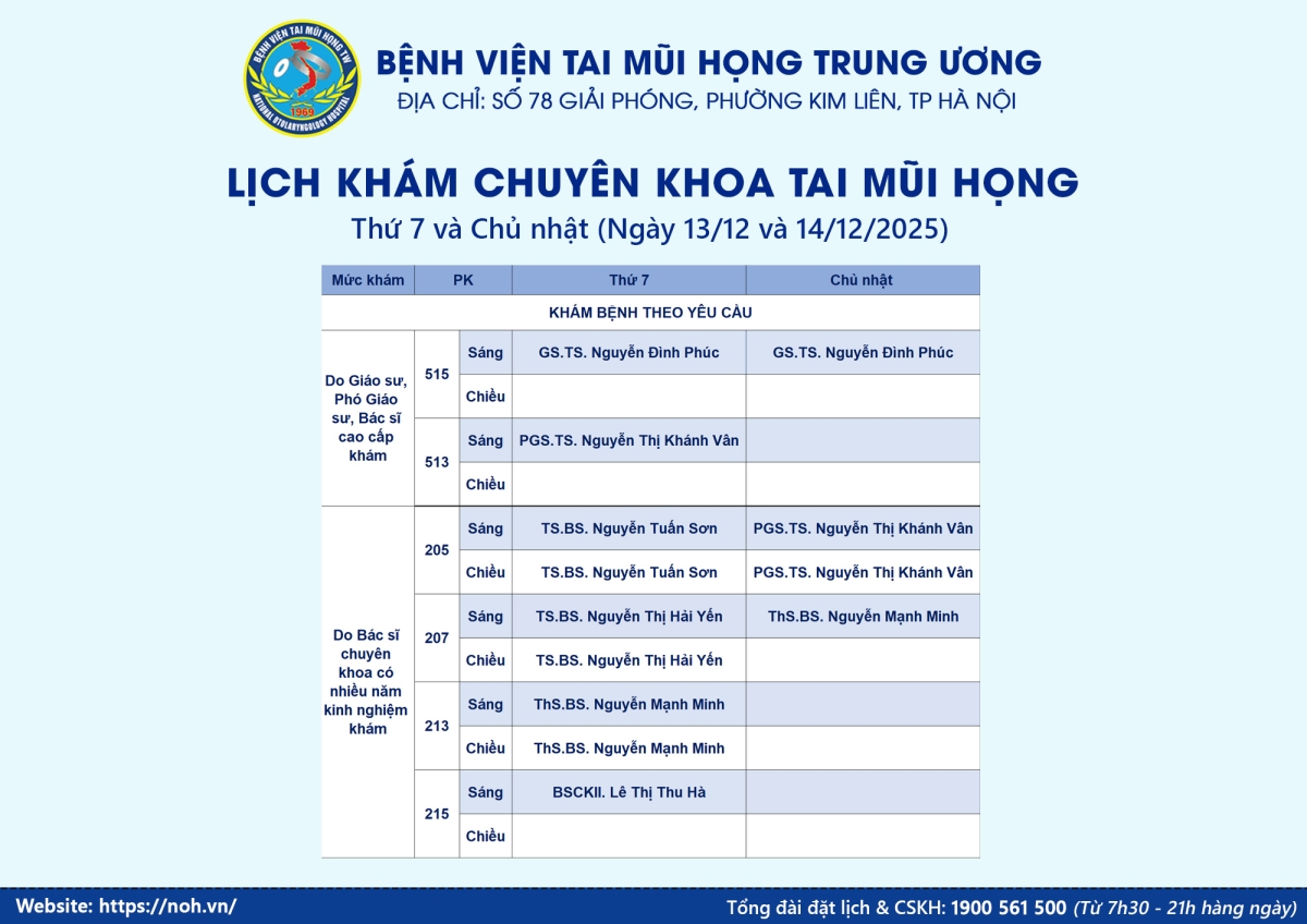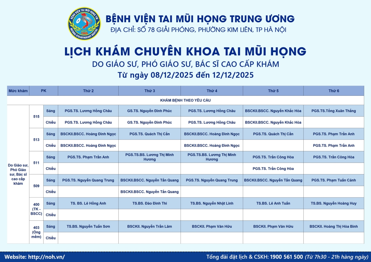 Lịch khám chuyên khoa Tai Mũi Họng (Từ 08/12/2025 - 14/12/2025)