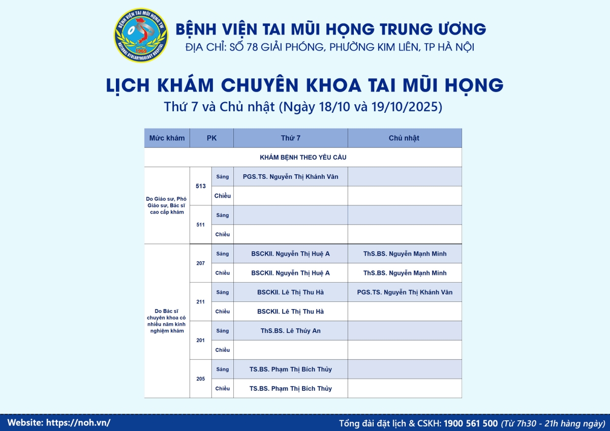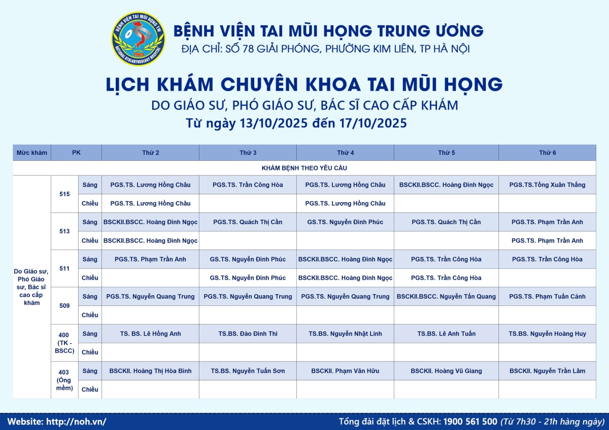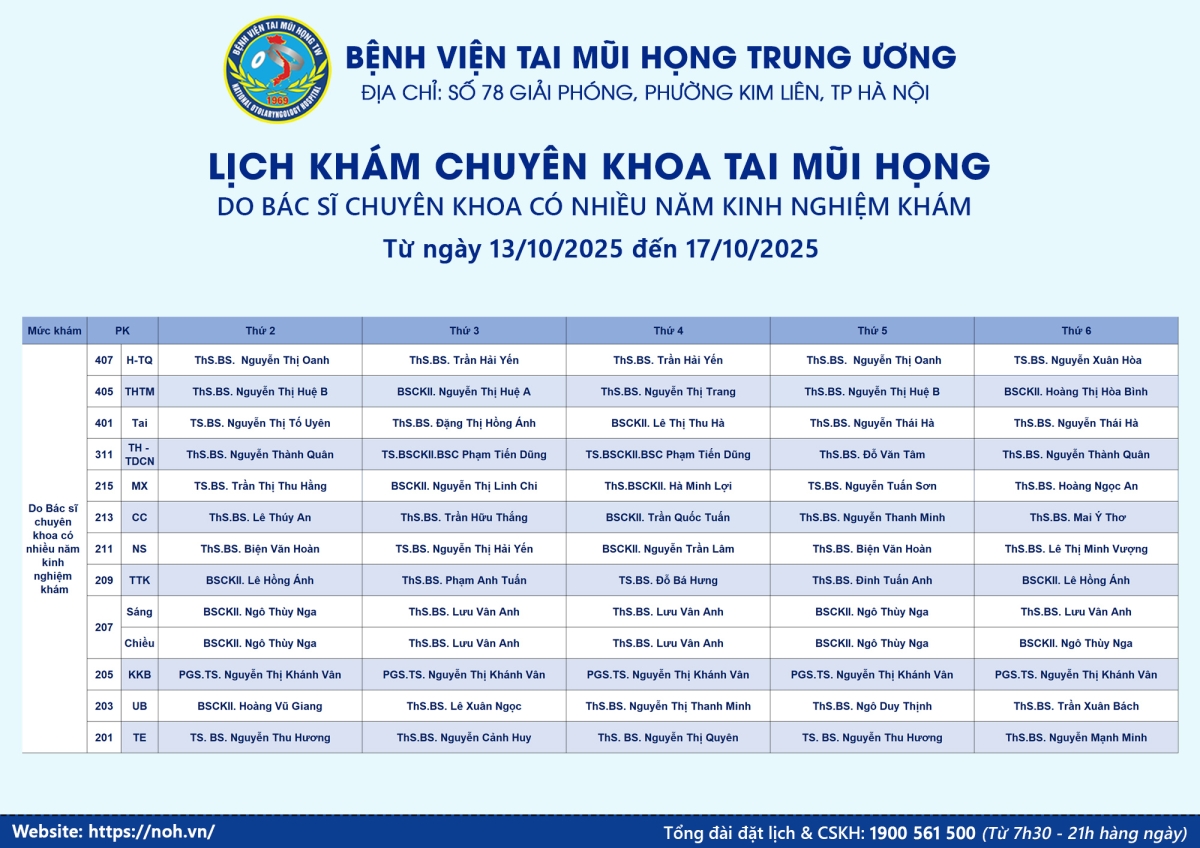 Lịch khám chuyên khoa Tai Mũi Họng (Từ 13/10/2025 - 19/10/2025)