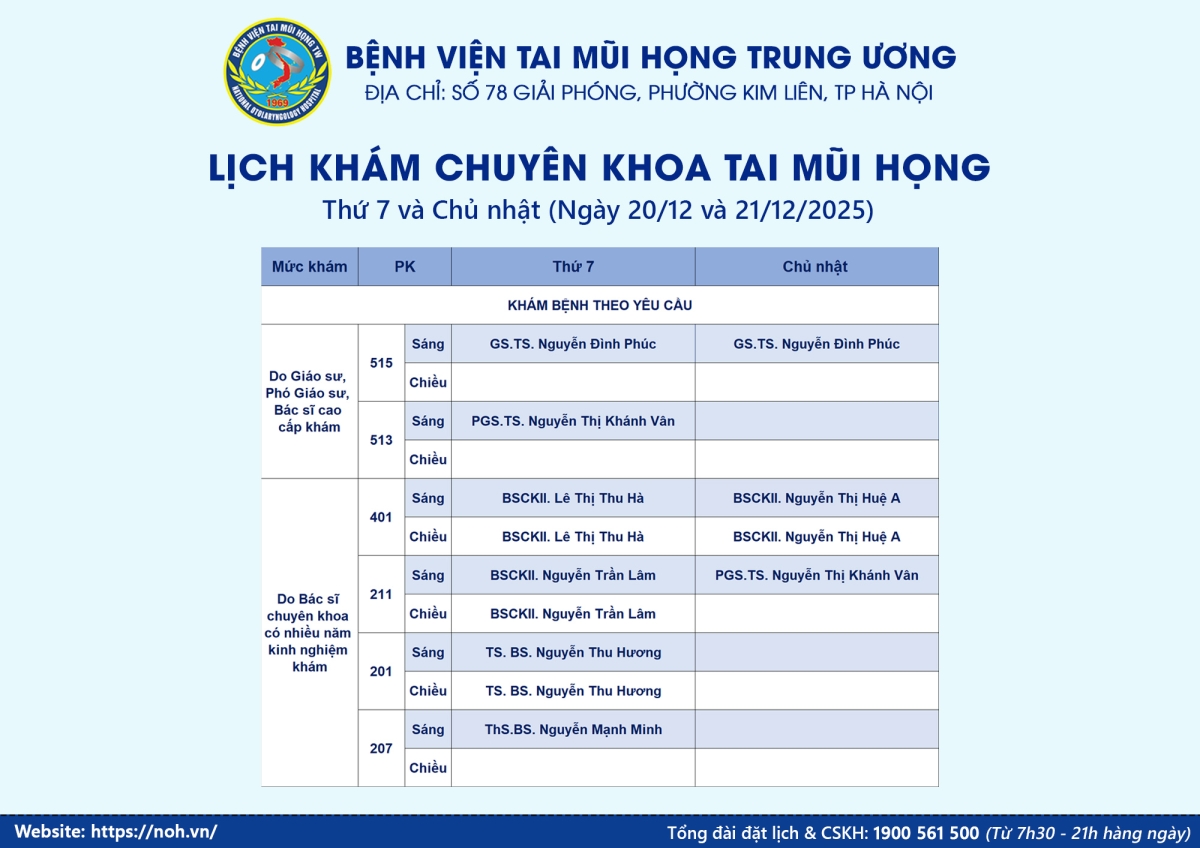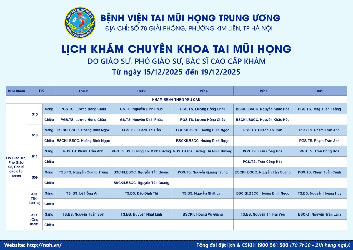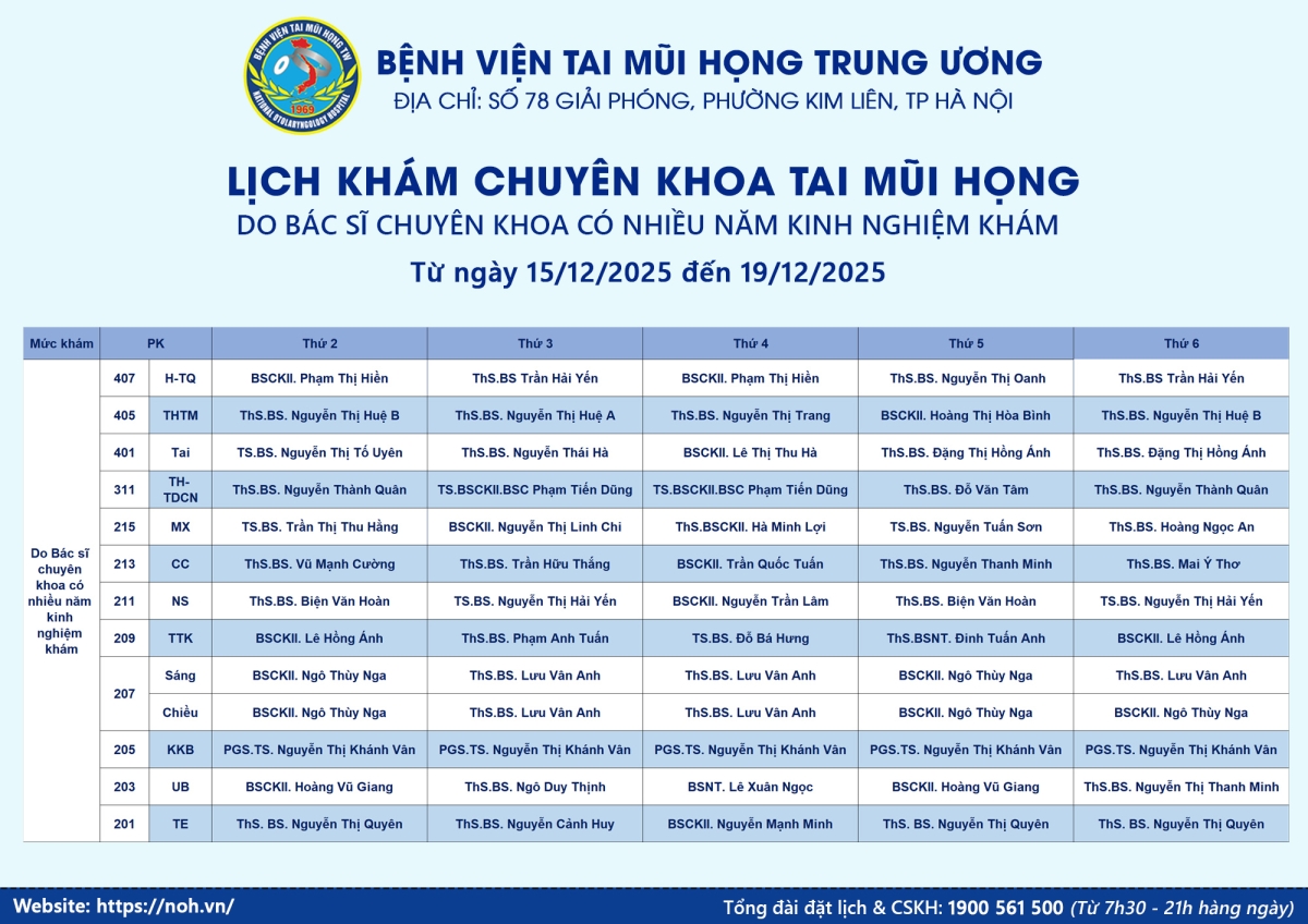 Lịch khám chuyên khoa Tai Mũi Họng (Từ 15/12/2025 - 21/12/2025)