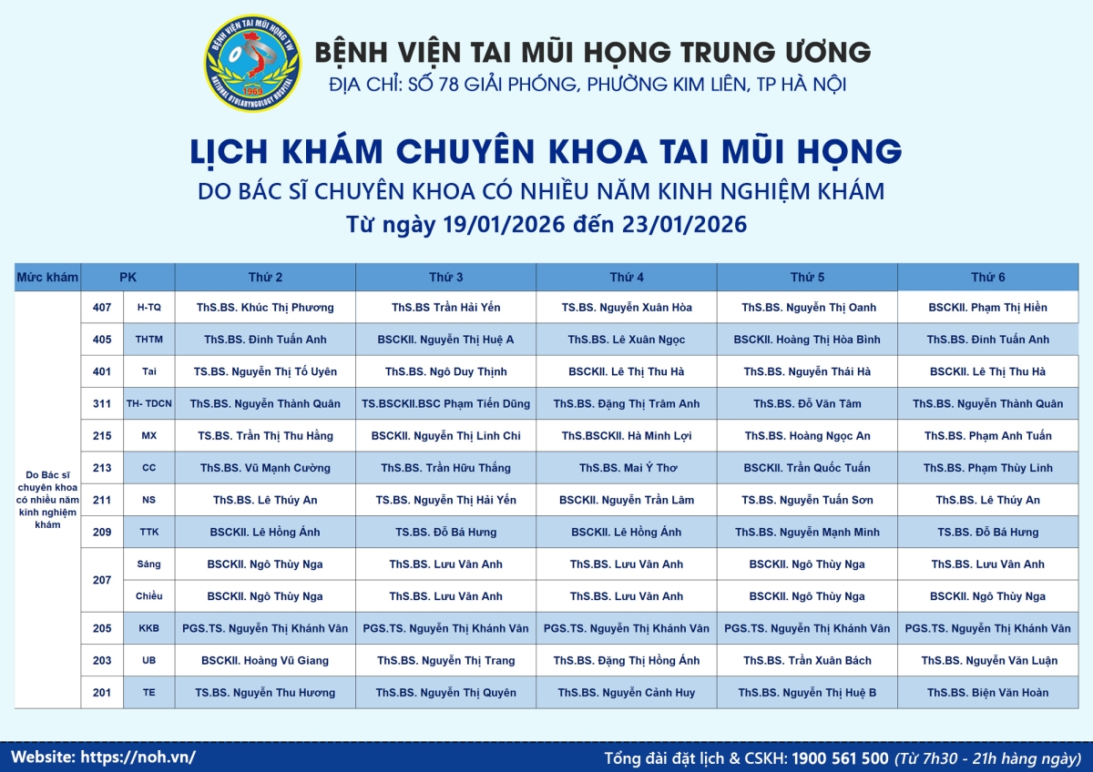 Lịch khám chuyên khoa Tai Mũi Họng (Từ 19/01/2025 - 25/01/2026)