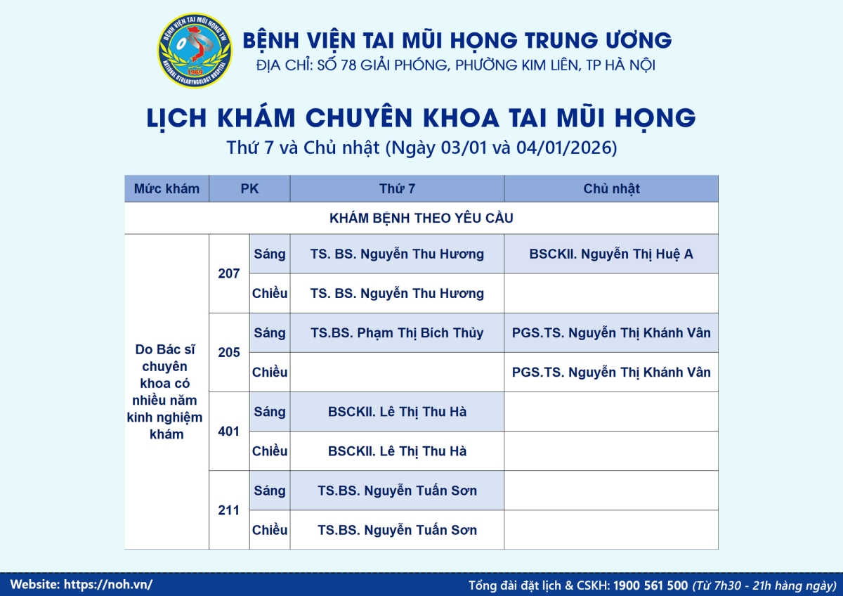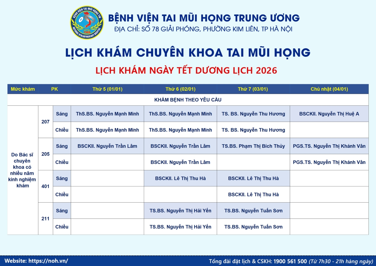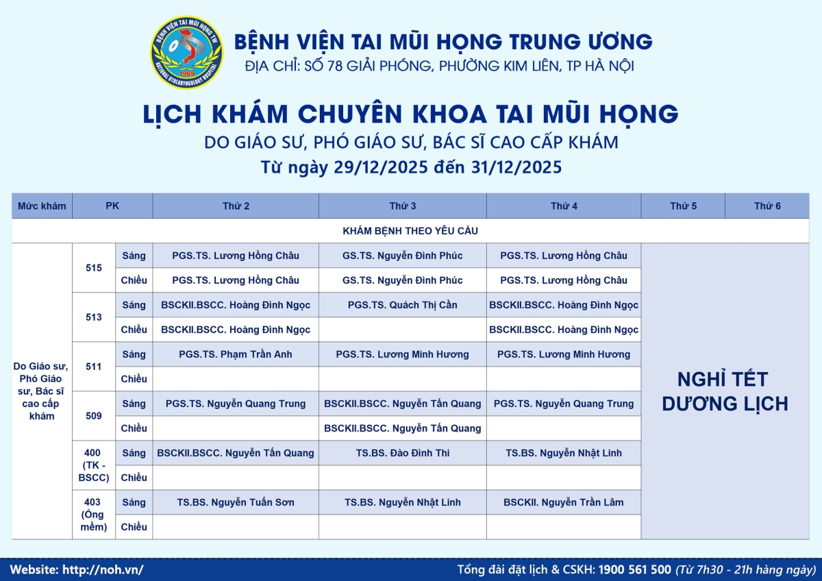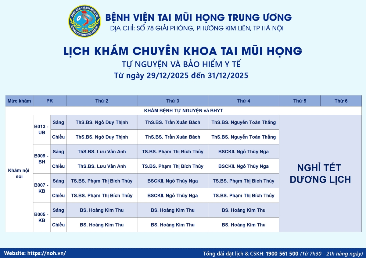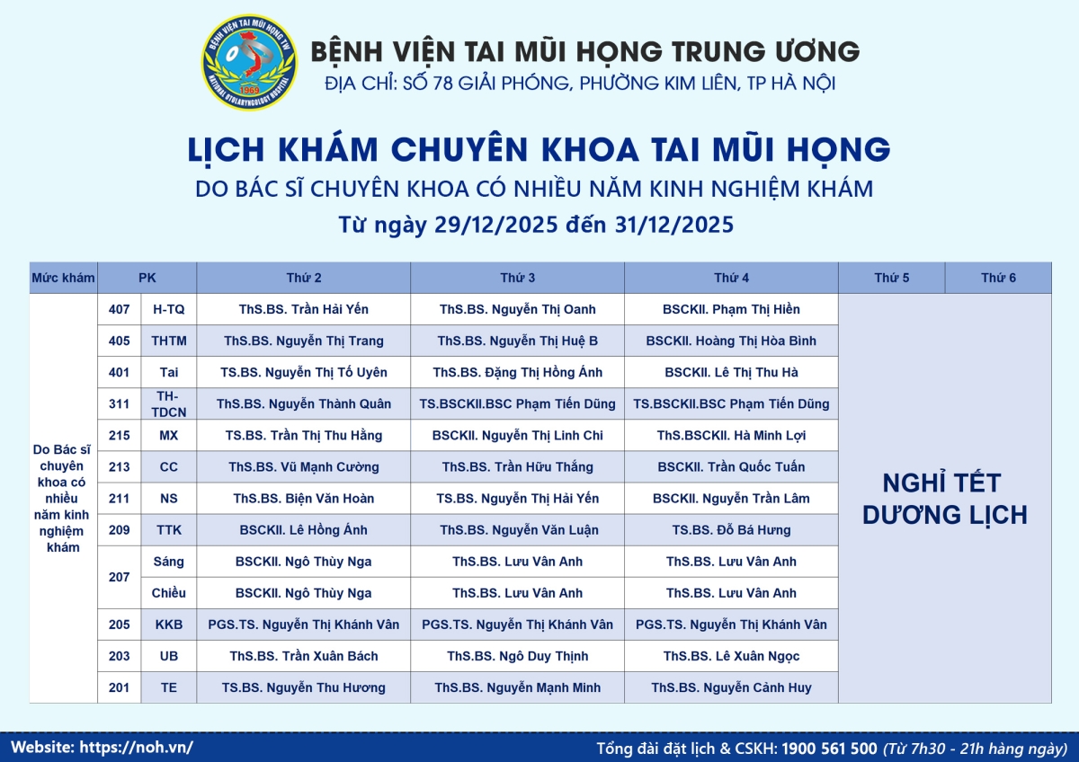 Lịch khám chuyên khoa Tai Mũi Họng (Từ 29/12/2025 - 04/01/2026)