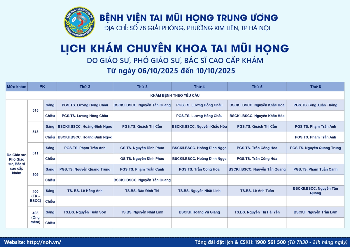 Lịch khám chuyên khoa Tai Mũi Họng (Từ 06/10/2025 - 12/10/2025)