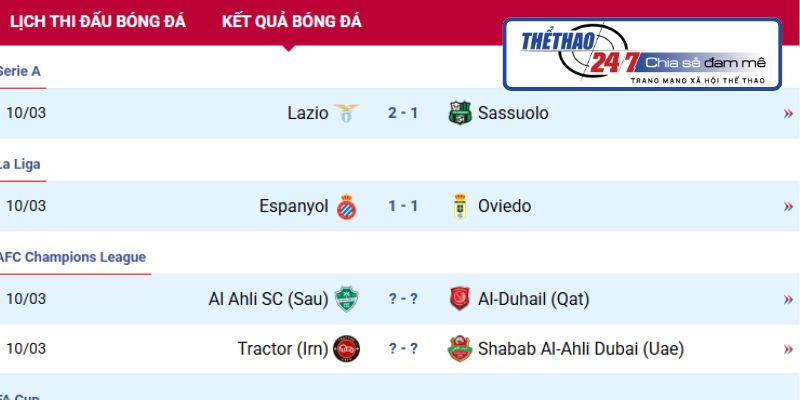 Giao diện chuyên mục bóng đá trên trang Thể Thao 247
