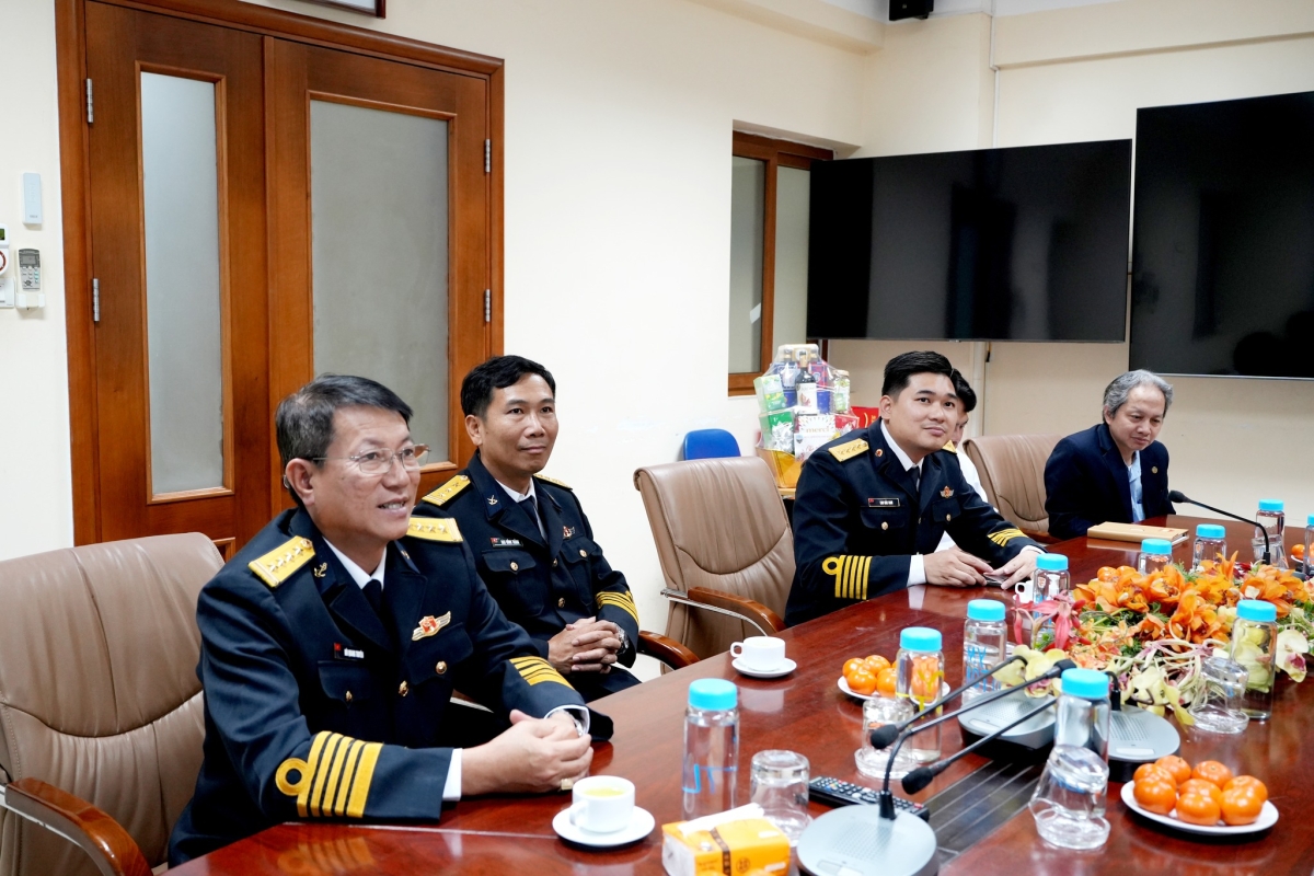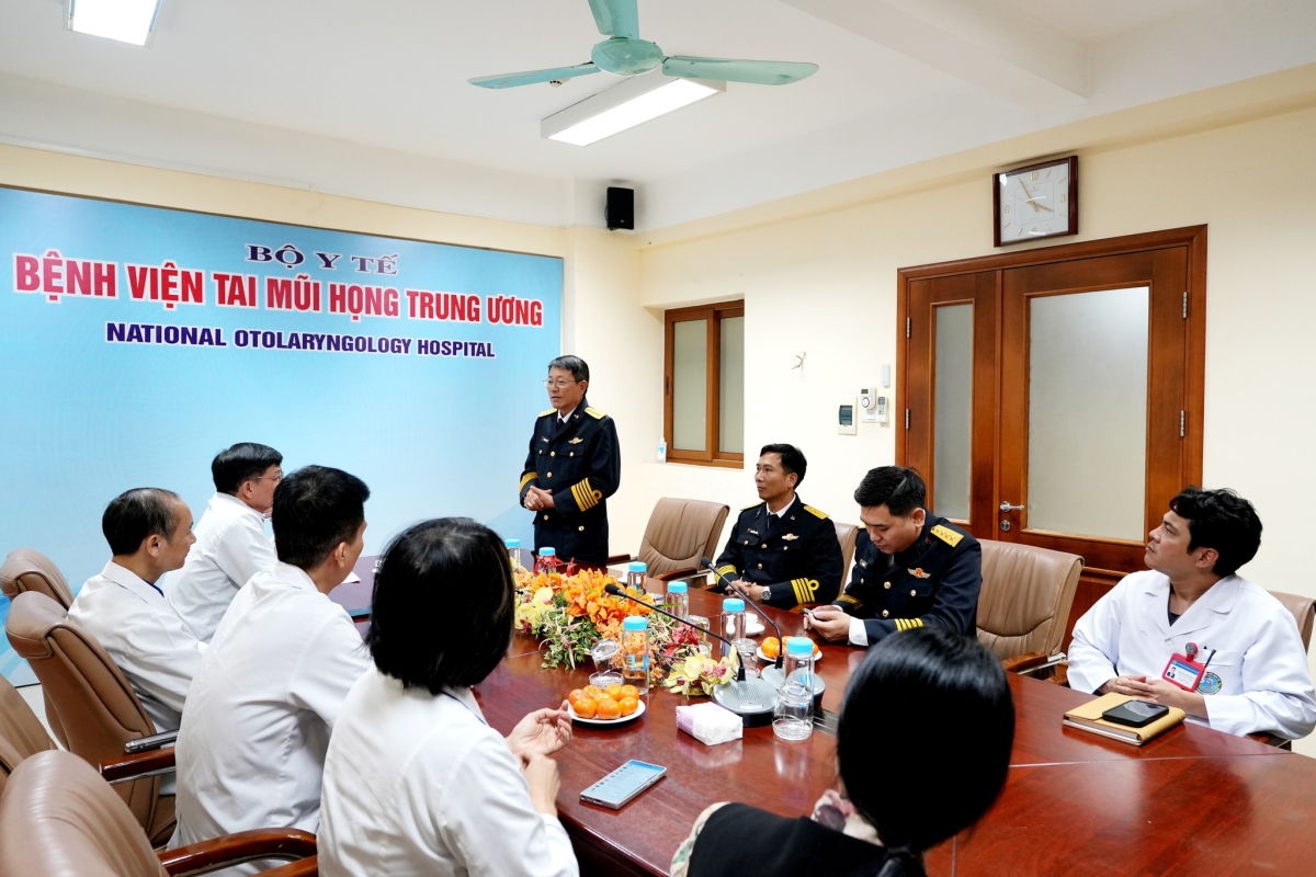 Thay mặt Đoàn công tác, Đại tá Bùi Quang Thuyên bày tỏ sự cảm ơn sâu sắc trước sự phối hợp chặt chẽ, tận tâm của Ban Giám đốc và đội ngũ y bác sĩ Bệnh viện Tai Mũi Họng Trung ương trong công tác chăm sóc sức khỏe cho cán bộ, chiến sĩ Hải quân Vùng 4 thời gian qua. Đồng thời, Đại tá mong muốn hai đơn vị tiếp tục duy trì và phát triển mối quan hệ hợp tác bền chặt, hiệu quả hơn nữa trong thời gian tới. Đồng chí trân trọng mời lãnh đạo và cán bộ Bệnh viện tham gia các chuyến thăm Quần đảo Trường Sa trong năm 2026 và những năm tiếp theo, qua đó tăng cường trải nghiệm thực tế, góp phần phối hợp tuyên truyền sâu rộng về biển đảo quê hương.