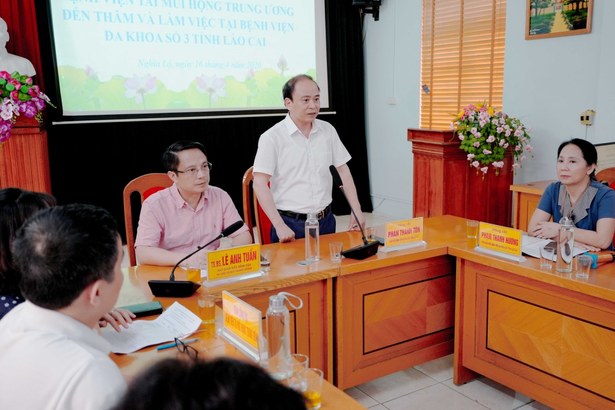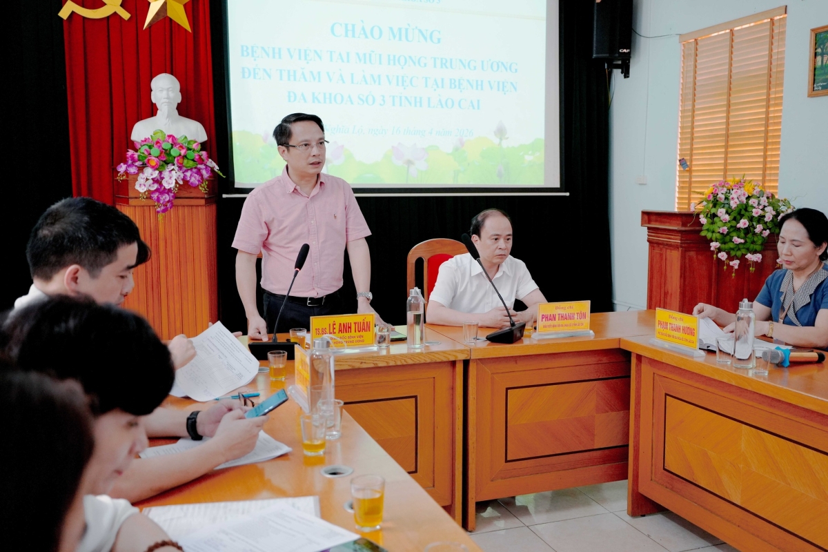 Phát biểu tại buổi làm việc, TS.BSCC Lê Anh Tuấn - Phó Giám đốc Bệnh viện Tai Mũi Họng Trung ương đánh giá cao nỗ lực không ngừng của Bệnh viện Đa khoa số 3 tỉnh Lào Cai trong việc nâng cao chất lượng khám, chữa bệnh và khẳng định Bệnh viện Tai Mũi Họng Trung ương sẵn sàng hỗ trợ khoa Tai Mũi Họng trong công tác đào tạo, hướng dẫn chuyên môn, chuyển giao kỹ thuật. Đồng thời, để quá trình chuyển giao diễn ra thuận lợi, TS.BSCC Lê Anh Tuấn đề nghị đơn vị chủ động nâng cấp cơ sở hạ tầng, chuẩn bị đồng bộ hệ thống máy móc, dụng cụ vi phẫu nhằm tạo cơ sở cho việc triển khai các hoạt động hỗ trợ một cách cụ thể, hiệu quả.