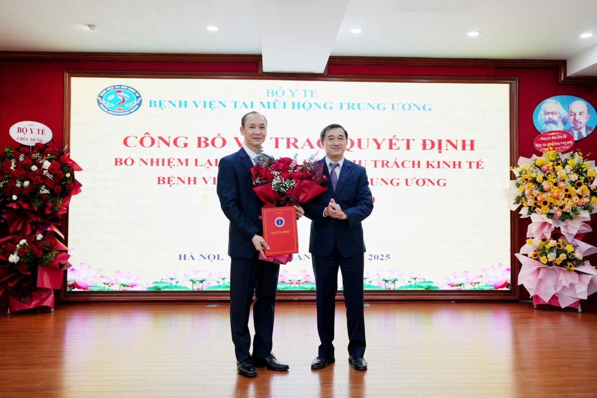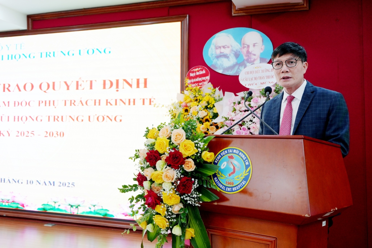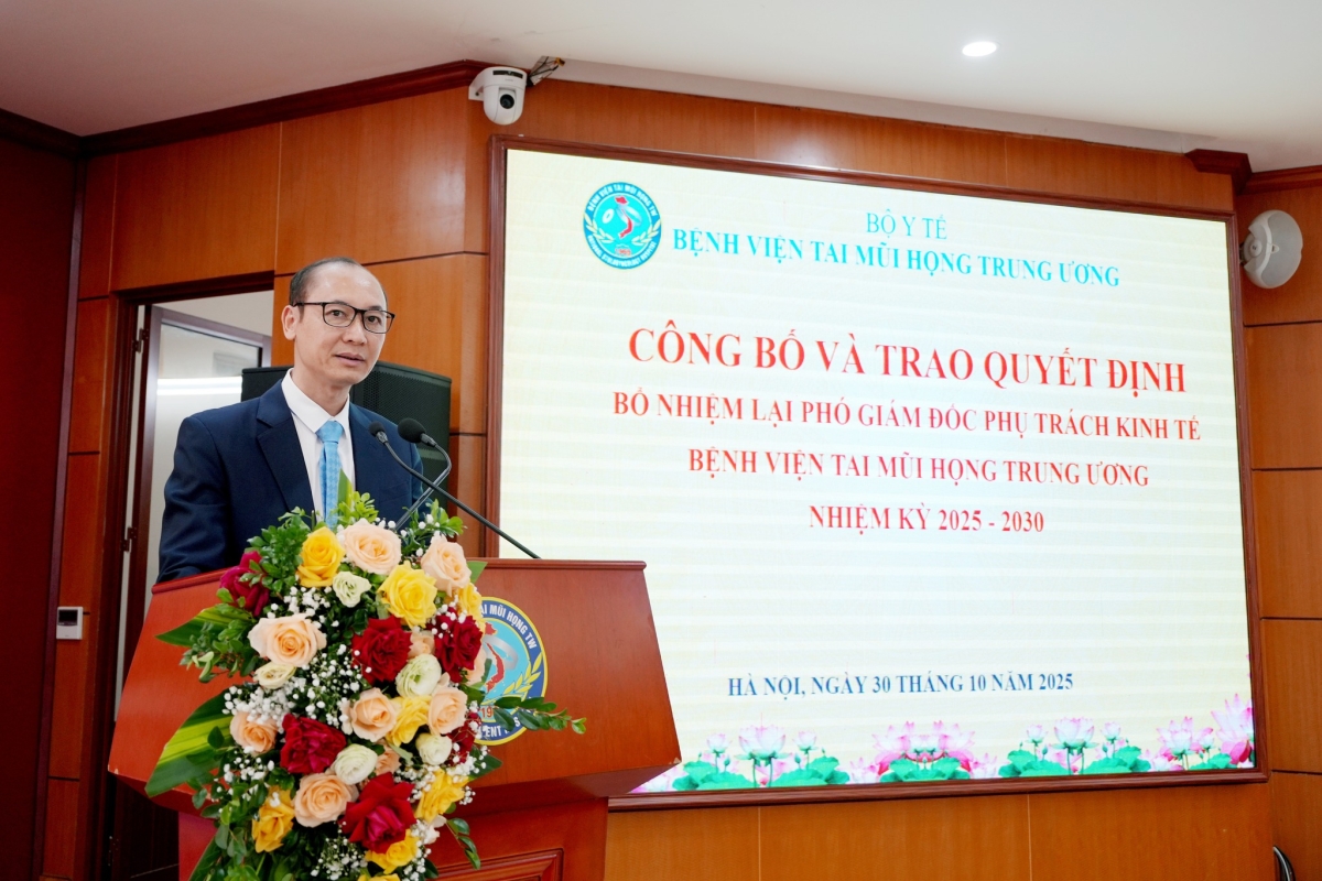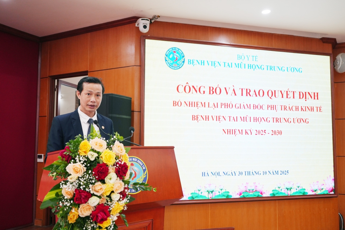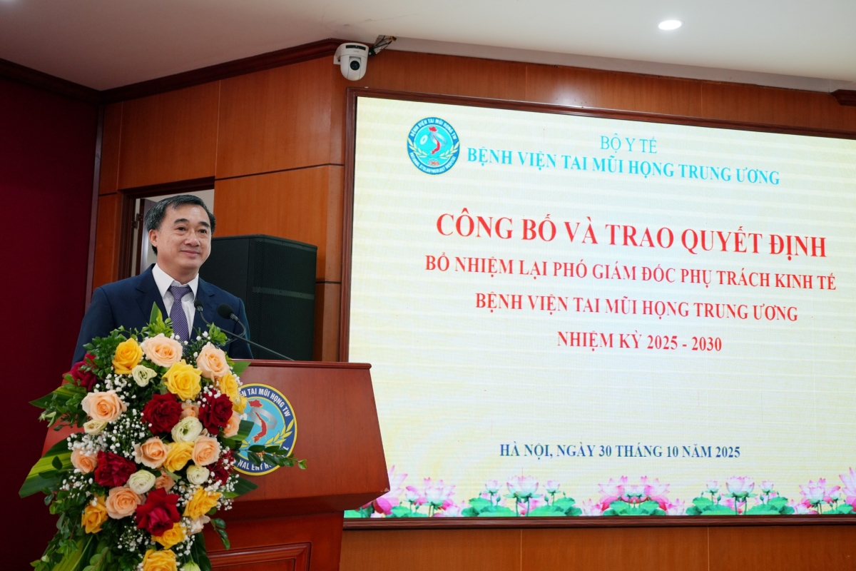 Sáng ngày 30/10/2025, tại Bệnh viện Tai Mũi Họng Trung ương, Bộ Y tế đã long trọng tổ chức Lễ công bố và trao Quyết định của Bộ trưởng Bộ Y tế bổ nhiệm lại chức vụ Phó Giám đốc phụ trách kinh tế Bệnh viện Tai Mũi Họng Trung ương đối với ThS.KS Đỗ Việt Thắng.