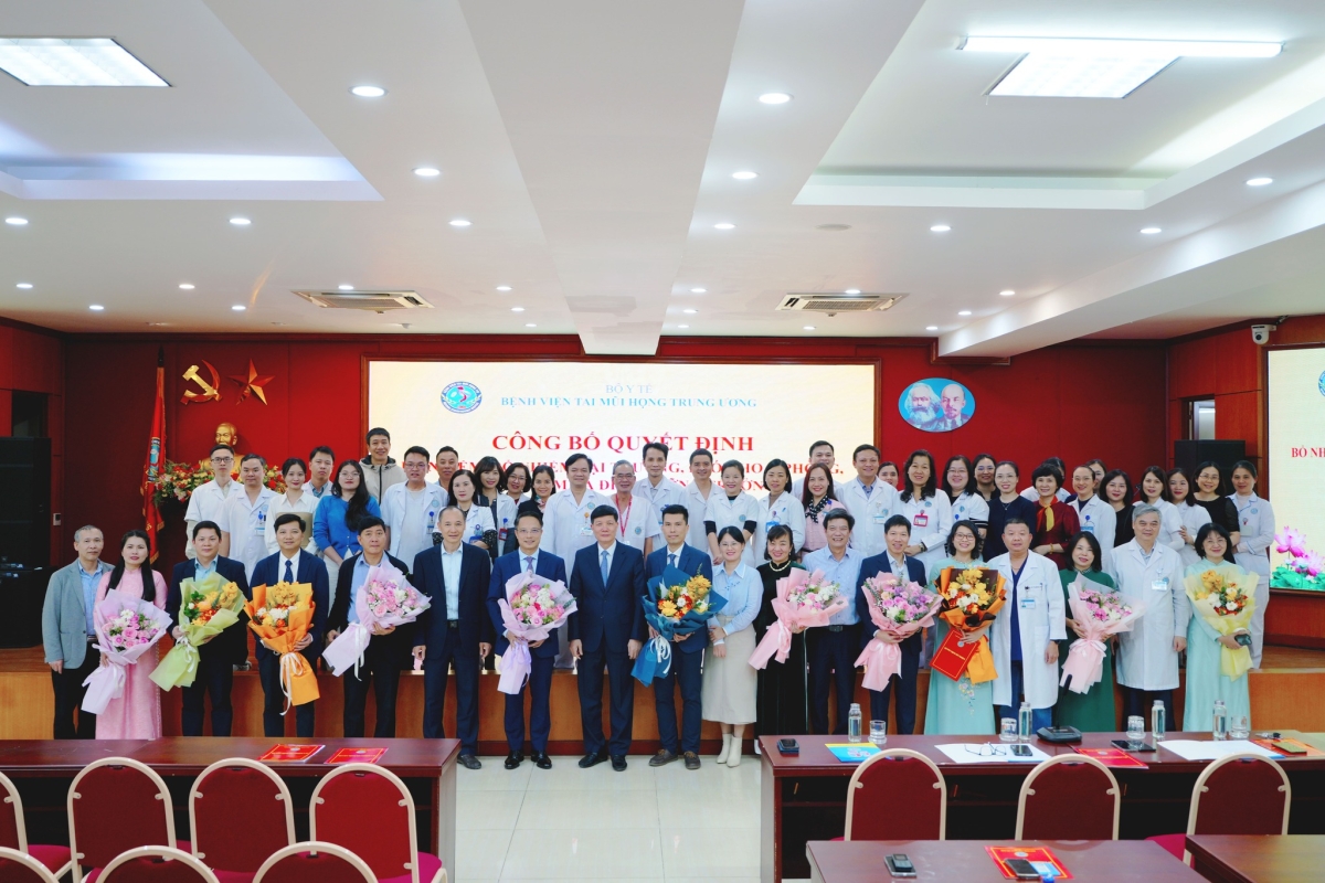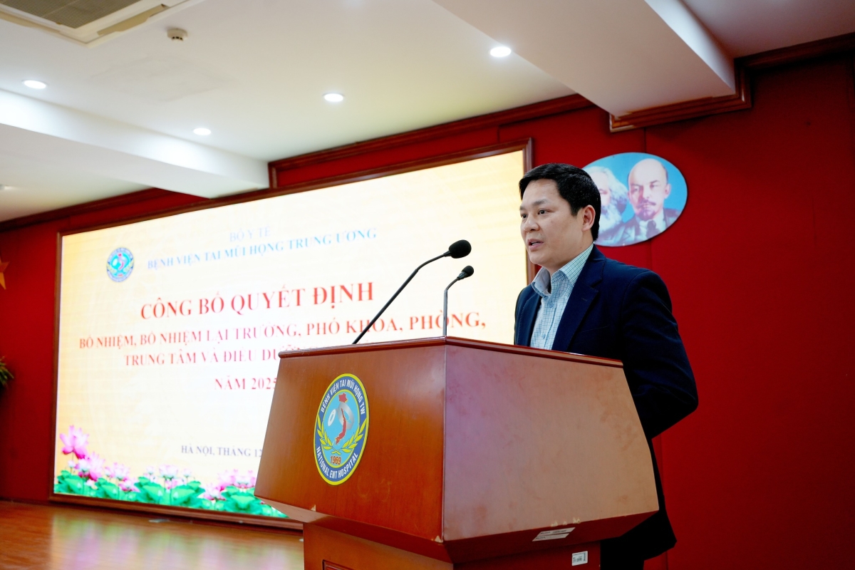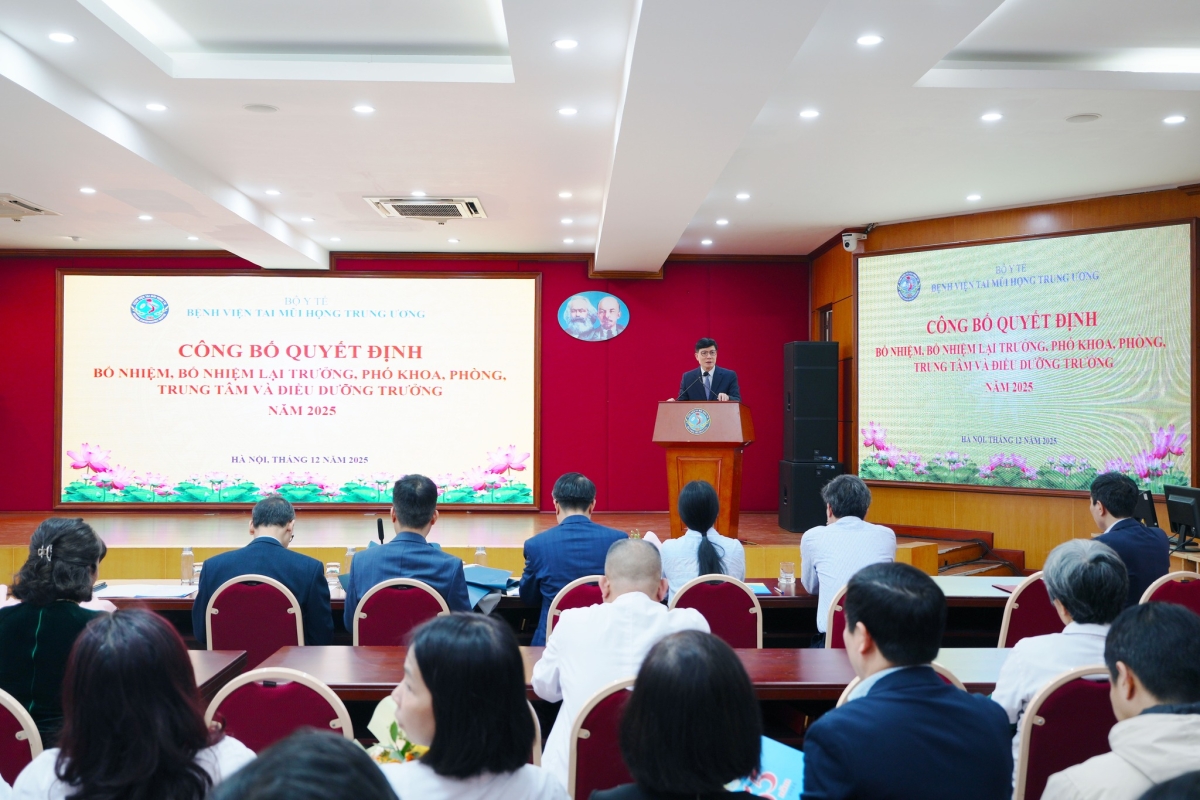 Nhằm kiện toàn bộ máy lãnh đạo, quản lý, đáp ứng yêu cầu phát triển chuyên sâu và nâng cao chất lượng khám, chữa bệnh của Bệnh viện trong giai đoạn mới, chiều ngày 31/12/2025, Bệnh viện Tai Mũi Họng Trung ương đã tổ chức Lễ công bố quyết định bổ nhiệm, bổ nhiệm lại Trưởng, Phó trưởng khoa, phòng, trung tâm và Điều dưỡng trưởng năm 2025.