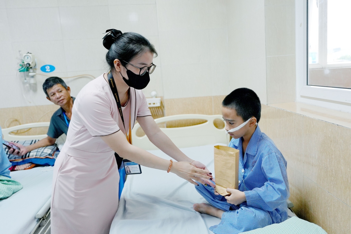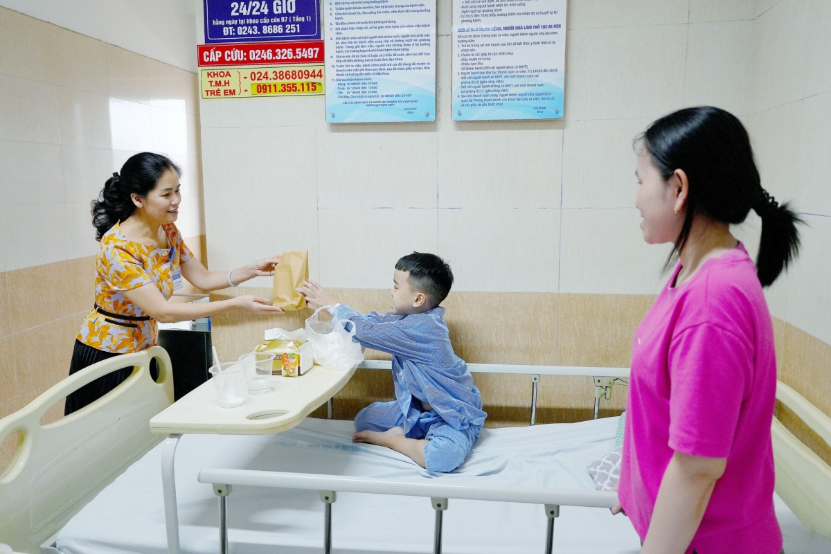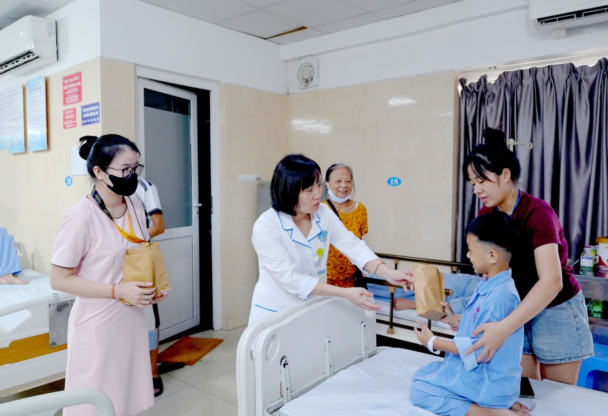 Theo đó, ngày 06/10/2025, đại điện các khoa, phòng cùng phòng Công tác xã hội đã tới từng giường bệnh thăm hỏi, động viên và tặng quà cho 30 bệnh nhi đang điều trị nội trú tại Bệnh viện. Những món quà tuy nhỏ bé nhưng thiết thực cho sức khoẻ, nhằm hỗ trợ dự phòng và điều trị các bệnh lý đường hô hấp cho các con. Nhân dịp này, 02 bệnh nhi có hoàn cảnh khó khăn cũng đã được trao thêm phần quà bằng tiền mặt để hỗ trợ phần nào cho gia đình các cháu.